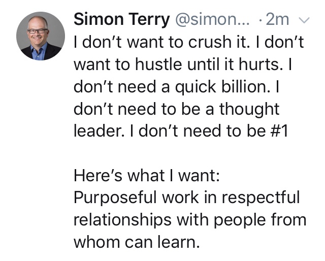 The tweet even has the typo that signals a rant. This tweet has got a far greater reaction than anything else I have shared. Why? People don’t want to ‘crush it’ – whatever that bro-speak means. The commonest comment is thanking me for being real and speaking a widely shared truth. People want to be real. They want real connection. The commodity that is most missed in this era of hype and instant fame is the simplest & potentially the easiest to achieve- purposeful work in respectful relationships with people from whom we can learn.