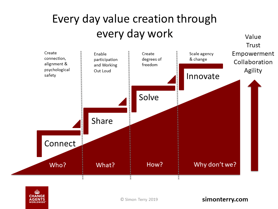 Planning for a successful collaboration must also leverage the understanding of communities in the Value Maturity Model of Collaboration. Communities are comprised of people who come together to share purpose and build trust. Organisations are comprised of many overlapping groups like this. If you want to engage these groups on Yammer or any other collaboration tool, you will need to work through how those people connect in purpose, share sufficient context to work together and begin to solve common problems with the capabilities of the organisation. Psychological safety, working out loud and the degrees of freedom to make change become critical accelerators of value on that journey and what ultimately powers the value of the work. The Value Maturity Model Canvas is a tool to enable anyone planning a collaboration to work through questions aligned to this model.